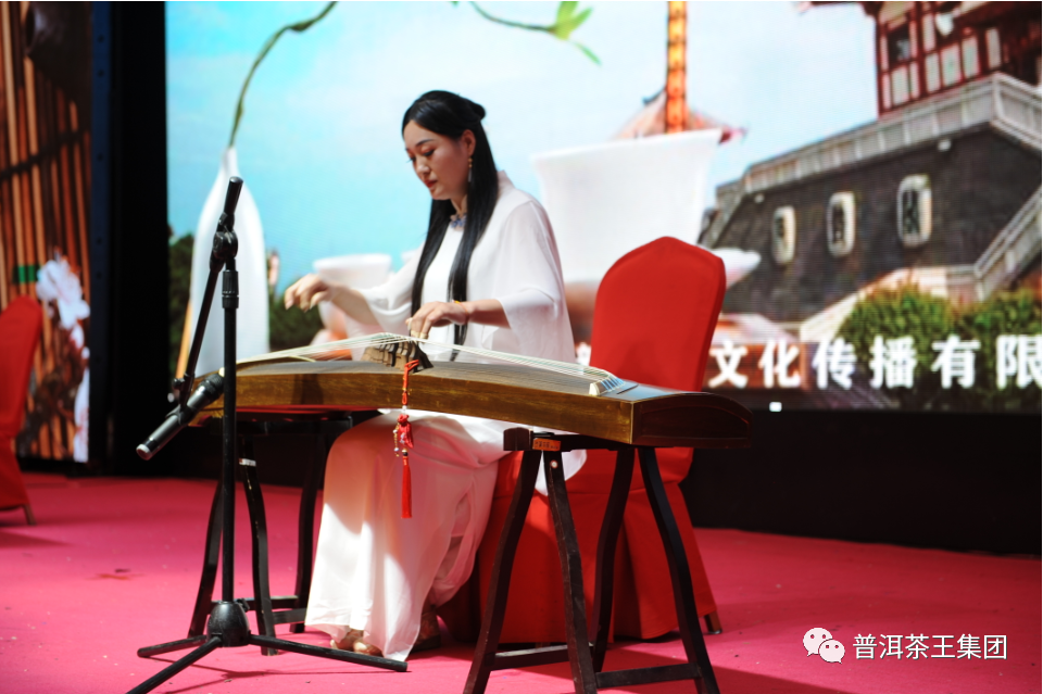 一曲《渔舟唱晚》,两名弹奏者一身素雅白衣,轻拨琴弦,曼妙灵动,诗情画意中,拉开了”沐云陈仓,悦享茶王“茶主题交流会的序幕。
