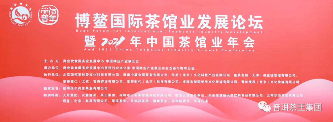 2021年10月18日——19日由商业饮食服务业发展中心、中国林业产业联合会主办,商业饮食服务业发展中心茶馆行业办公室、中国林业产业联合会生态茶与咖啡分会承办,北京国恒茶标委文化科技有限公司、海南中展会展服务有限公司、华茗(北京)文化科技产业有限公司、星茶发展(天津)供应链管理有限公司、星茶雅仁(北京)管理咨询有限公司、星茶时代(北京)科技有限公司、成都市楚国梵天文化传媒有限公司、青年视界(北京)文化传媒有限公司执行的"博鳌国际茶馆业发展论坛暨2021年中国茶馆业年会"在海南省琼海市博鳌隆重举行。