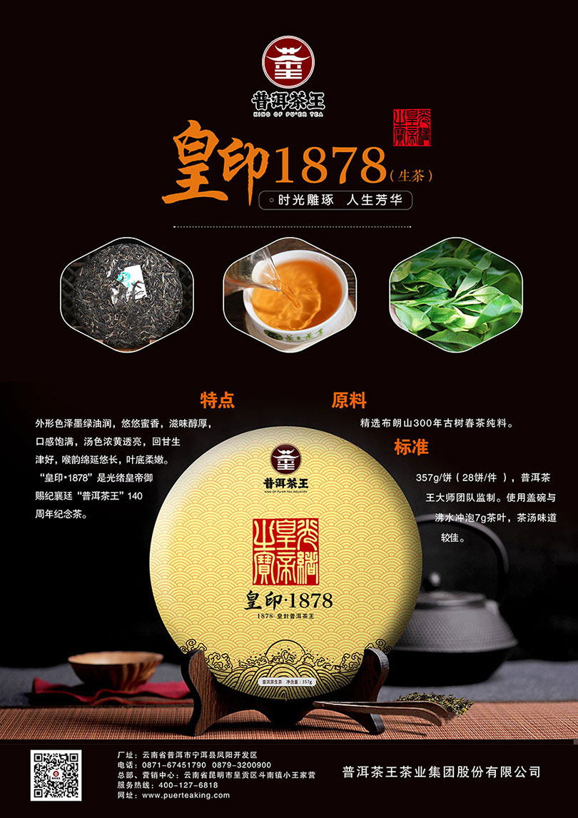 价格:880元 年份:2017年 类别:普洱生茶 时光雕琢 人生芳华 特点:外形色泽墨绿油润,悠悠蜜香,滋味醇厚,口感饱满,汤色浓黄透亮,回甘生津好,喉韵绵延悠长,叶底柔嫩。“皇印·1878”是光绪皇帝御赐纪襄廷“普洱茶王”140周年纪念茶。 原料:精选布朗山300年古树春茶纯料。 标准:357g/饼(28饼/件 ),普洱茶王大师团队监制。使用盖碗与沸水冲泡7g茶叶,茶汤味道较佳。